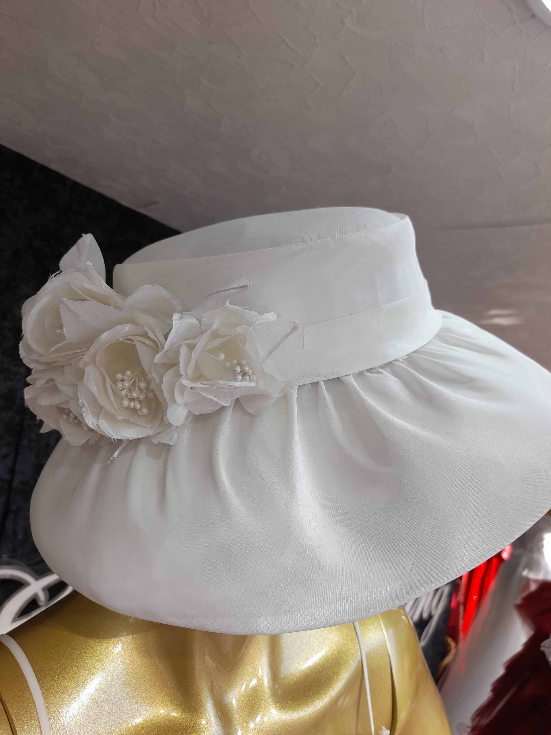 SATEN KUMAS ILE TASARLANMIS EL YAPIMI ÇİÇEKLERLE SUSLENMIS GELIN SAPKASI